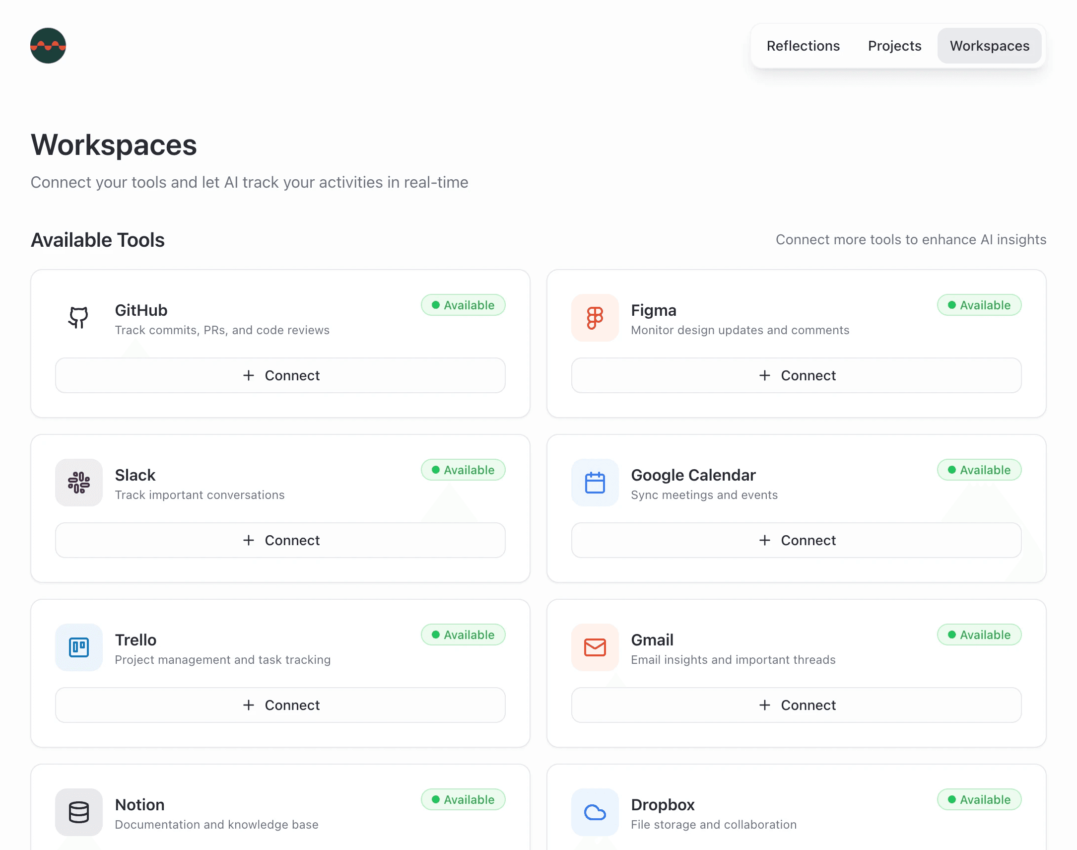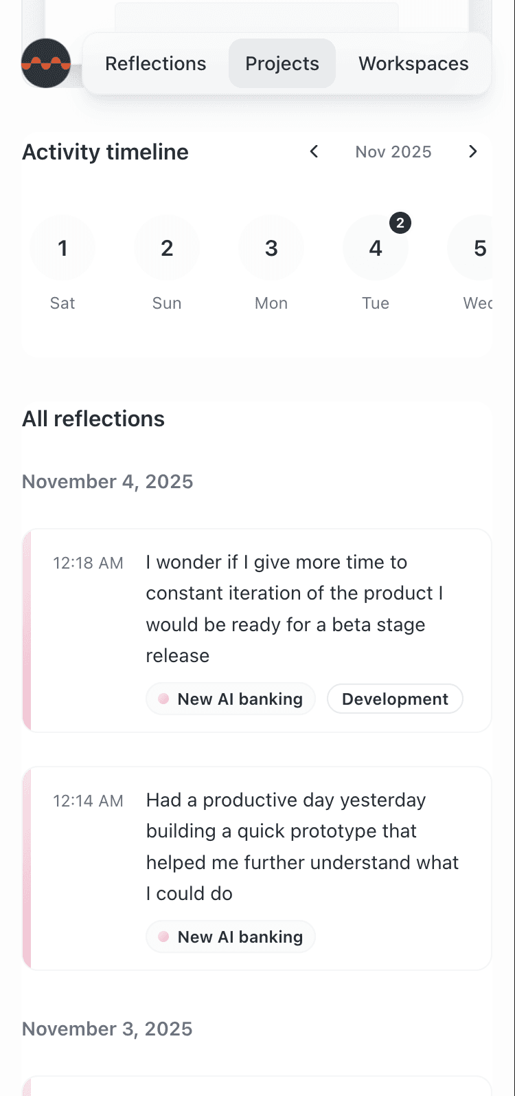 Track productivity and reflections through voice/text notes, decision timelines, and passive workflow observation.